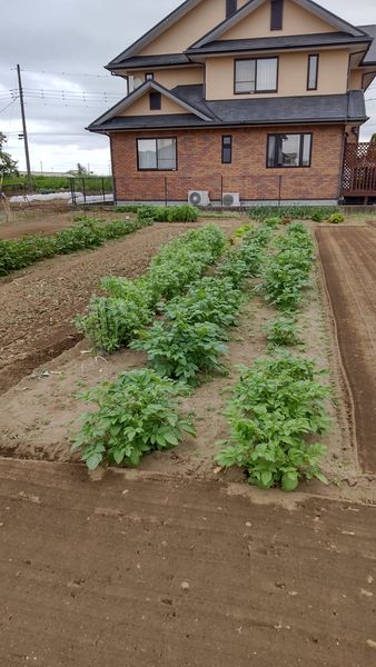 💚昨日午後5時頃元区長さんがトラクターを持ってきて畑を畝ってくれました。ここ(画像右)に夏野菜を撒いていきます。馬鈴薯はご覧の通りすくすくと育っています(画像左)。感謝。