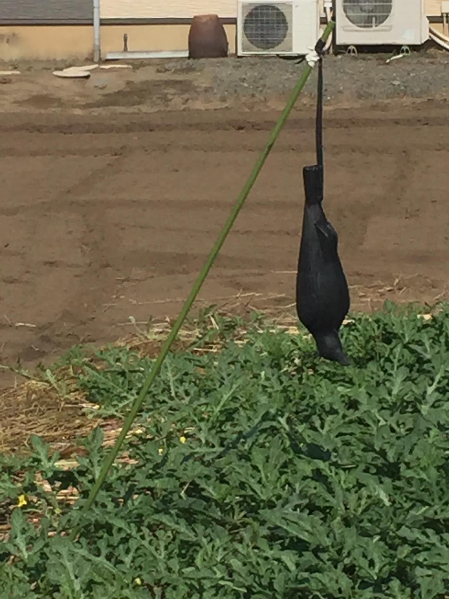 💙昨日午後五時頃ふと窓から南の畑を見ると真っ黒な物体が吊り下げられてるではありませんか。よく見るとカラスの死体のようなもの。外に出て恐る恐る近付いて見るとカラスの模型でした。これが有名なカラス除け。初めて見ました。隣家の畑もスイカを栽培しているのでそのためかと思われます。でも観察能力のあるカラスのこと。いつかはバレてしまうのでは。