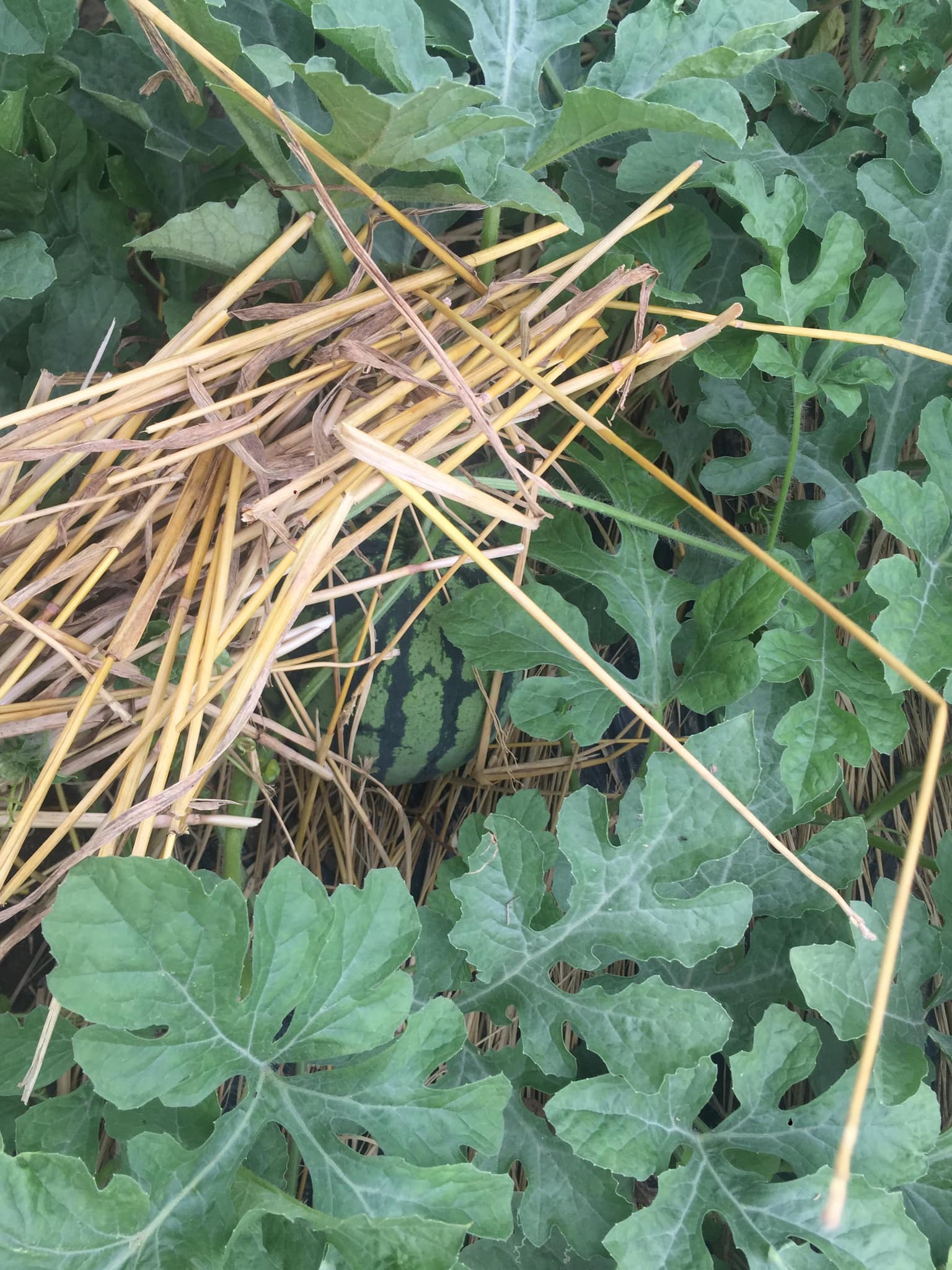 💚大玉スイカは10cm大のが3個、小玉スイカは野球の玉大が5個。7cm弱のメロンが5個以上。画像では葉っぱや藁の下で見づらいのですが。大きくなるだけでなく甘くなってほしいですね。