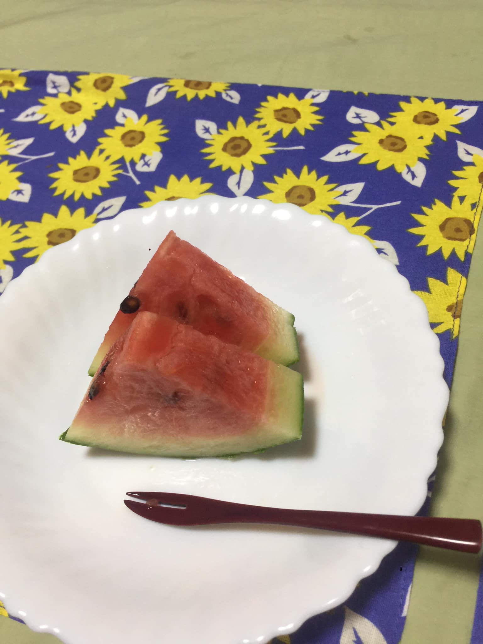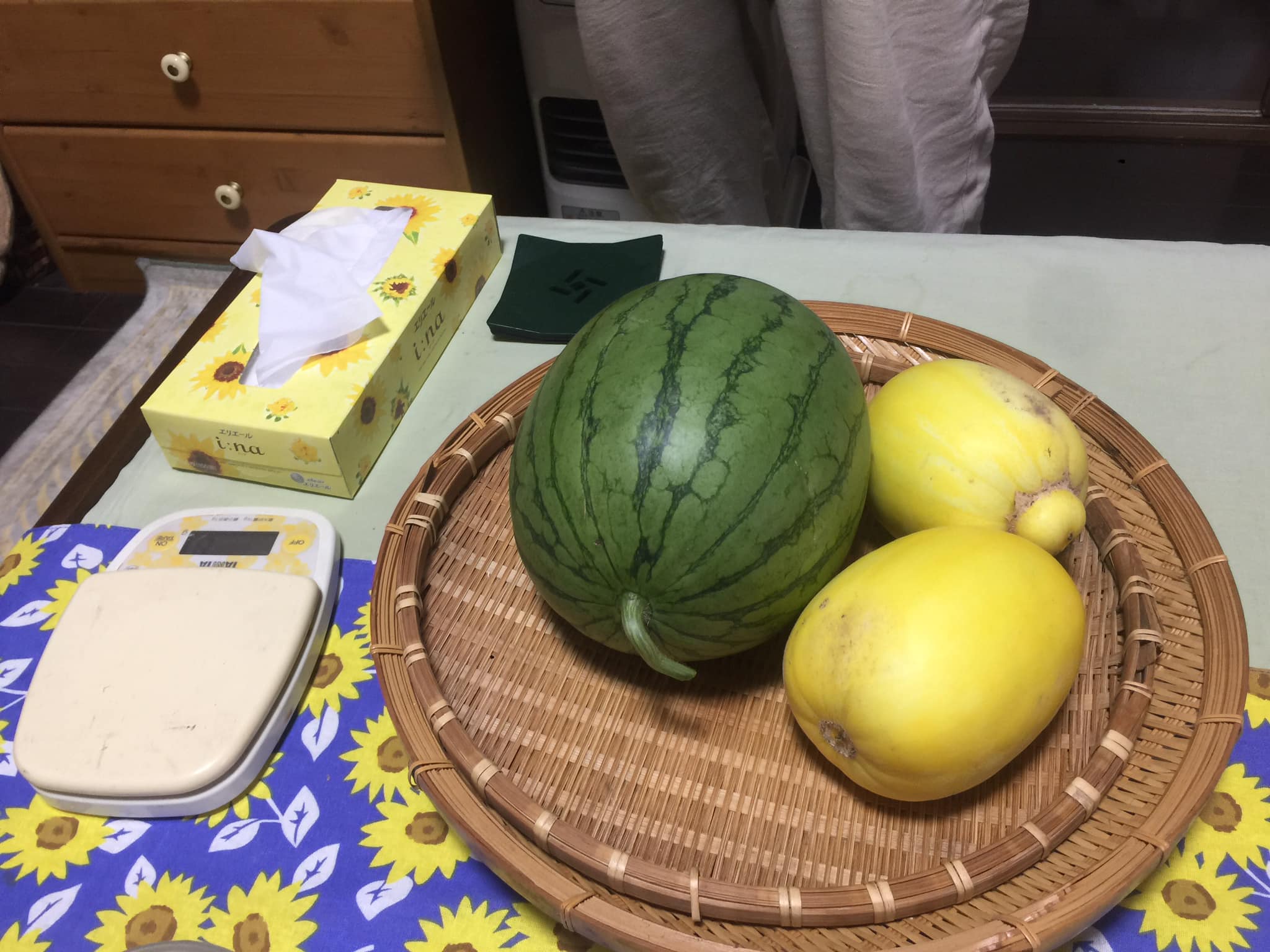 💚私が午睡している間に家内が小玉スイカを一個だけ採ってきました。ヘルパーさんと一緒に初物頂きました。程よい甘さ。美味しい!この大きさで約1.5kg。スーパーで税別780円也。このサイズ以下だとまだ熟れていないのですが、葉に隠れてゴロゴロなってます。マクワウリはまだまだありますが、七日くらい置いてから食べるとより美味しくなると聞いたのでじっと我慢。大玉スイカは明日にしました。