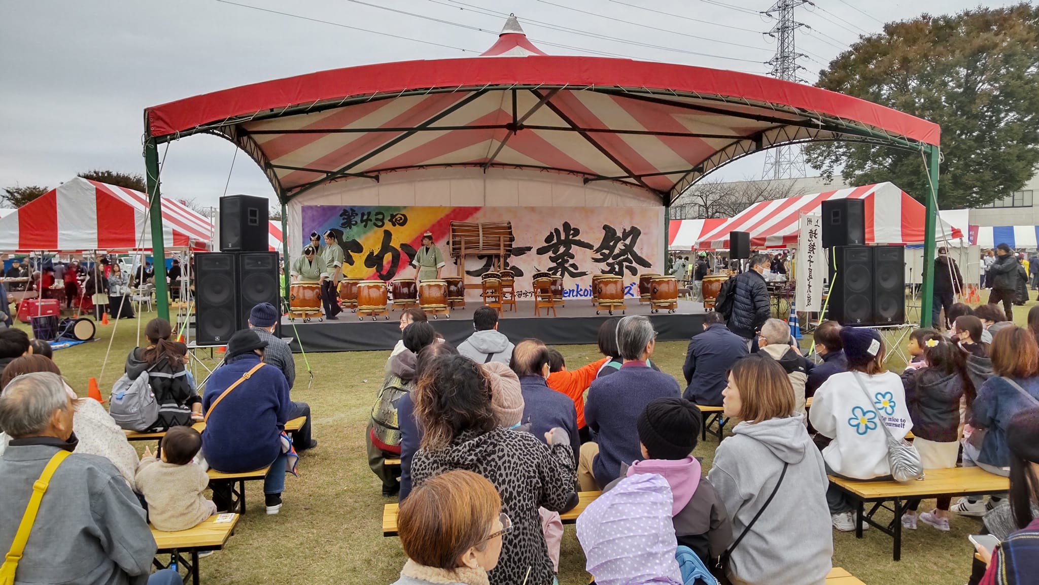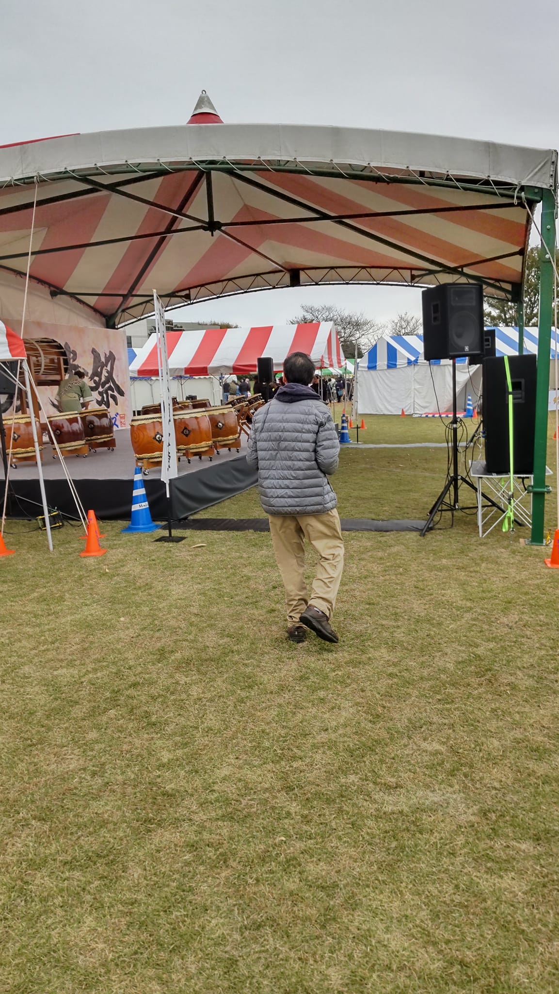 💚10時から屋外ステージで和太鼓グループ二組の演奏です。リズムに合わせていつものマサイ族ジャンプ。「産業祭は燃えるぜ」と身体で表現してます。