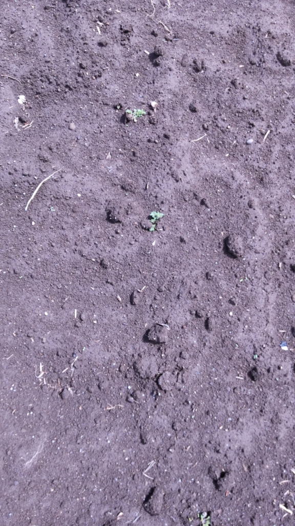 💚画像では分かりずらいのですが、ジャガイモの芽が出てきました。しかも農業青年が「ギリギリか全滅するでしょう」と予言していた「キタアカリ」からです。6月末に収穫てす。ところが男爵からはまだ芽が出ていません。