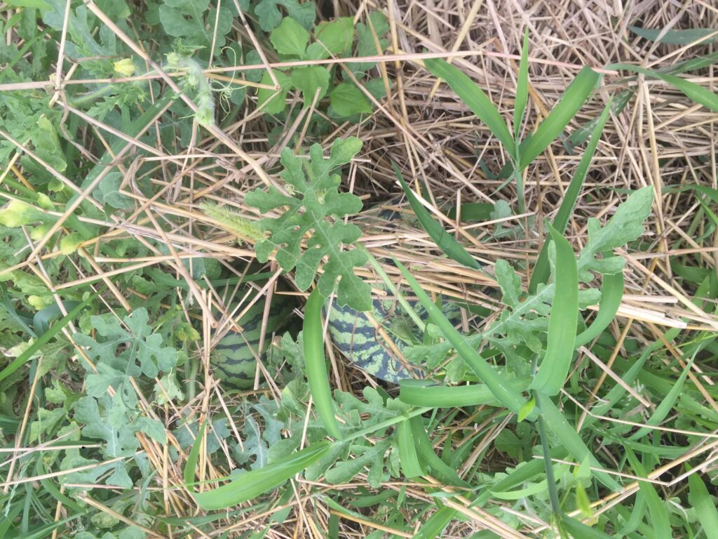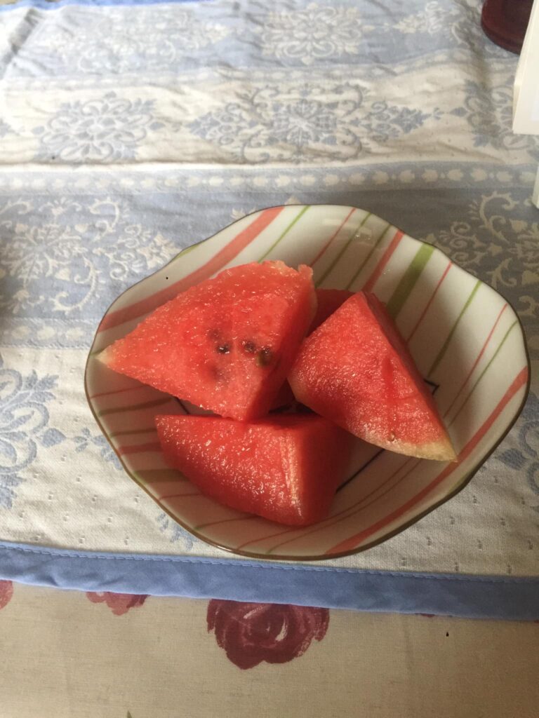 💚雷鳴が遠くで聞こえ始めたので、ヘルパーさんと一緒にスイカの収穫に行きました。大玉スイカは目視で6個以上、小玉スイカは10個以上。ヘルパーさん用に大玉一個と小玉一個を採ってきました。割って食べたところ、とても甘くみずみずしい。💖主の恵みに感謝。